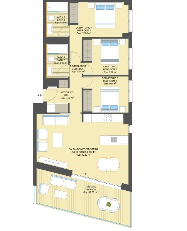 FLAT IN A LUXURY RESIDENTIAL COMPLEX BY THE SEA Imagine a place where the sea and nature become the protagonists of an incredible story: yours. Imagine an environment where you can give free rein to your imagination and live a thousand adventures by land sea. Welcome to this new Residencial in Campoamor, the home where you can live the life you have always dreamed of with the most beautiful horizon in the background: the Mediterranean. A 3-bedroom flat with a large terrace, a kitchen equipped with modern appliances, the most exclusive details and communal areas designed for the enjoyment of the whole family. Living in this residential is to feel the Mediterranean in every room of the house. The Residential is located in the highest part of Campoamor, very close to La Glea beach and the marina. A contemporary and modern architectural design that offers exclusive homes with top quality finishes, fusing spaciousness and new technologies in terms of efficiency and construction. Its imposing façade, the balance of its forms, the garden inside and the enormous terrace of the homes make this residential a beautiful architectural reference in the Mediterranean. You will be able to enjoy green areas for strolling and sunbathing. The communal areas include a large indoor heated swimming pool, a chill out area on the roof terrace, as well as a sports area to enjoy outdoor exercise, a gym, a children’s play area and a large outdoor swimming pool together with a smaller one for children and a gourmet room. And because we know you’ll love cycling in the area, we’ve set aside space for bike storage. Residents will enjoy a premium residential development that is fully accessible for people with reduced mobility and with the guarantee of living in an area protected by private security. Just 1000 m from the beach and a short drive from shopping centres, famous golf courses, restaurants with exquisite gastronomy and major cities such as Alicante and Murcia just 1 hour away. And all this in a climate with 300 days of sunshine a year and almost 20ºC average annual temperature. The perfect place for your holidays or to establish your permanent residence.
