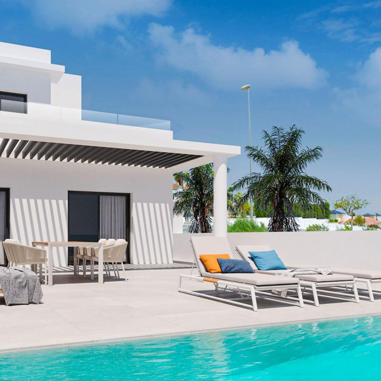 Modern Luxury Villa with Mountain Views in Ciudad Quesada, Costa Blanca Contemporary Design and Exceptional Comfort Discover this elegant new-build villa in Ciudad Quesada, one of the most sought-after residential areas on the Costa Blanca. Set on a 300 m² plot with a beautifully landscaped garden and a private 3×12 m swimming pool, this villa offers the perfect blend of modern architecture, natural beauty, and Mediterranean comfort. The property boasts 265 m² of interior space distributed over two levels, designed to maximize light, space, and functionality. Large windows flood the living areas with natural sunlight while offering breathtaking views of the mountains and surrounding nature. Spacious Layout with Flexible Living Options The villa features 4 bedrooms, with the possibility to create a 5th bedroom or an additional lounge area, adapting perfectly to your lifestyle. On the main floor, you will find an open-plan living and dining area connected to a modern fully equipped kitchen with high-end appliances, creating a seamless flow to the terrace and pool area; ideal for entertaining or relaxing outdoors. On the lower level (underbuild), the remaining bedrooms provide a cool and peaceful atmosphere, with direct access to the garden. The property also includes a closed garage, laundry area, and high-quality finishes throughout. High-End Finishes and Sustainable Features Every detail of this villa has been carefully designed for comfort and efficiency. It includes: Fully furnished kitchen with integrated appliances Bathrooms with furniture, shower screens, and electric towel heaters Air conditioning by ducts (fully installed) Photovoltaic solar panels for energy savings Electric shutters in living room and bedrooms Armoured entrance door for maximum security Prime Location in Ciudad Quesada Nestled in an exclusive and quiet area, this villa enjoys an unbeatable location close to everything. La Marquesa Golf Course is just 1 km away, offering a haven for golf lovers. The Blue Flag beaches of Guardamar del Segura are only 6 km away, while Torrevieja and Orihuela Costa can be reached in under 15 minutes. Alicante International Airport is approximately 40 km (35 minutes), ensuring excellent connectivity. Experience the Mediterranean Lifestyle Surrounded by orange groves, sports clubs, restaurants, and all essential services, Ciudad Quesada offers a vibrant yet peaceful environment. It’s the ideal setting for those seeking a luxury home in the sun; perfect as a permanent residence, vacation retreat, or investment property. Contact us today to schedule a visit and experience the best of Mediterranean living in your new home in Ciudad Quesada.