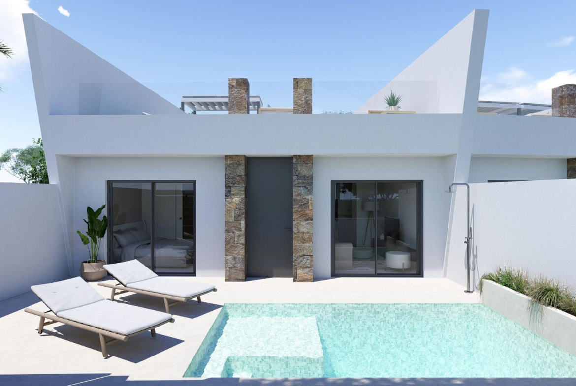 Modern New Build Townhouses with Private Pool in El Alba Resort Torre Pacheco Contemporary Homes in a Growing Mediterranean Resort Community This new build development consists of only 4 exclusive townhouses in the first phase, located in El Alba Mediterranean Resort in Torre Pacheco. Designed on one single level, these modern homes offer a perfect combination of comfort, functionality and Mediterranean outdoor living. El Alba Resort is an emerging residential area surrounded by open landscapes and golf courses, just a short distance from the town of Roldan where you will find supermarkets, restaurants, banks and daily services. The resort already features a social club with swimming pool and restaurant, and a commercial area is currently being developed, adding further convenience and value to the location. Single Level Living with Private Garden and Solarium Each property offers 2 bedrooms and 2 bathrooms, one of them ensuite, with an open plan kitchen connected to a bright living room. The layout is carefully designed to maximize natural light and create a seamless connection between indoor and outdoor spaces. All homes include: Fully equipped kitchen with appliances Bathrooms with furniture, mirror, lighting and shower screens Fitted wardrobes with drawers in bedrooms Pre installation of ducted air conditioning Interior and exterior LED lighting Three photovoltaic solar panels with 1.5 kW capacity per property The exterior areas are designed for year round enjoyment, featuring a private garden with swimming pool, a terrace and a large private solarium with a summer kitchen, ideal for outdoor dining and relaxing under the sun. Quality Features Designed for Comfort and Efficiency These homes are built with elegant and functional interiors, focusing on energy efficiency and modern living. A private parking space is located within the plot, ensuring convenience and security. The combination of solar panels, quality insulation and smart design provides an energy efficient home ideal for permanent living, holiday use or rental investment. Excellent Location Near Golf Courses, Beaches and Airports Roldan town center 2 km Mar Menor beaches 15 km Mediterranean Sea beaches 20 km La Torre Golf Resort 5 km Terrazas de la Torre Golf 6 km Murcia Corvera Airport 18 km Cartagena city 30 km This strategic location allows easy access to golf, beaches, services and transport connections while enjoying a peaceful residential environment. A Smart Investment in the Costa Calida These townhouses in El Alba Mediterranean Resort offer an excellent opportunity to own a modern property with private pool in a fast growing area of Torre Pacheco. Contact us today to receive more information or to arrange a visit to these exclusive new build homes.