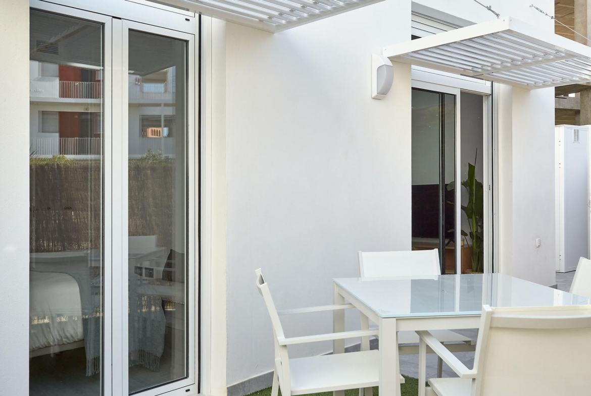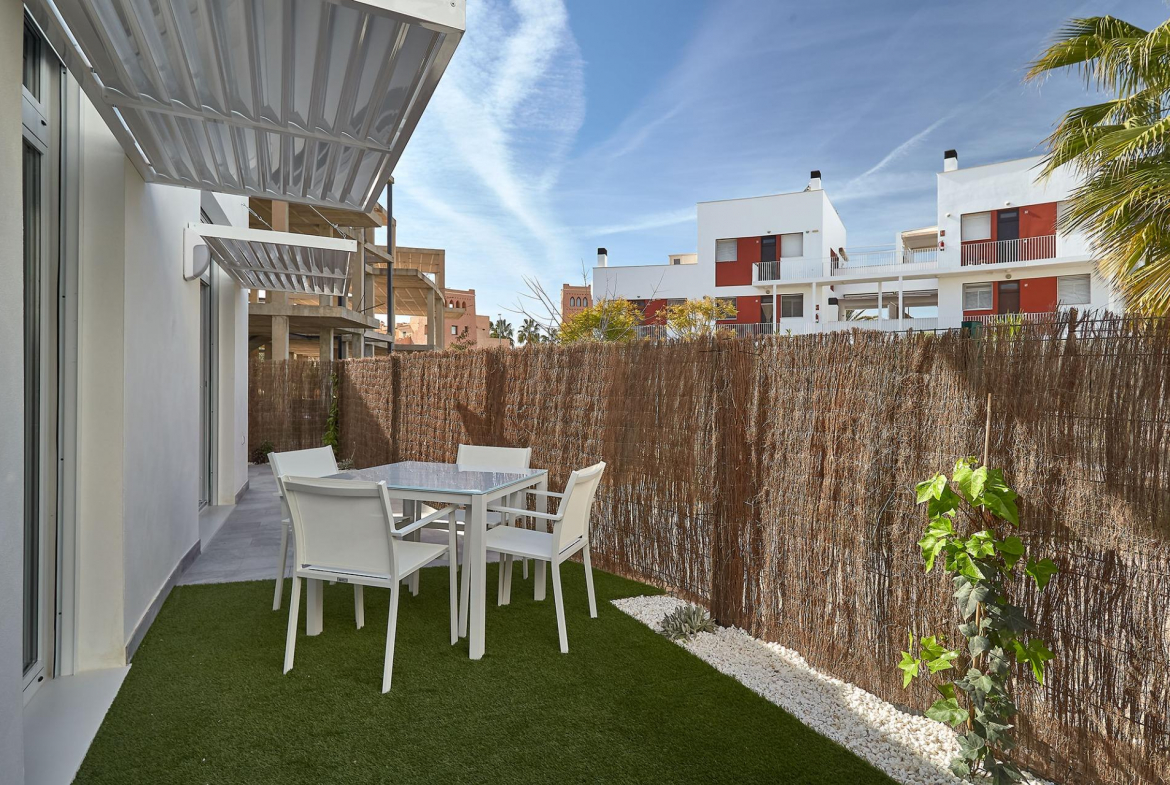 NEW BUILD RESIDENTIAL COMPLEX IN VERA New Build residential of apartments in Vera just 400m from the huge Vera beach named “El Playazo”. The typologies are ground floor with two private gardens, one in each orientation, which allows you to enjoy sun or shade whenever you want depending on the time of day or the season of the year. The first floors have terraces and the penthouses have large solariums. All the apartments have extra height ceilings (2.95 m) providing a great feeling of spaciousness. The kitchen comes fully furnished and equipped integrated with the living-dining area with a bar area. The doors and fitted wardrobes are lacquered in white and the floor is made of laminated wood. The hot-cold air conditioning and the hot water are generated by a state-of-the-art DAIKIN Aerothermal device, a technology that saves up to 70% of electricity consumption compared to traditional systems. All bathrooms come with a shower instead of a bathtub, with recessed mirrors and also with a stone countertop and glass partition in the main bathroom. The blinds in the living room and master bedroom are electric, hermetically sealed and with adjustable slats. The gardens and solarium are delivered with the floors finished combining artificial grass and a beautiful paving imitating wood. Each house includes a private outdoor parking space. Each block of the promotion has an independent elevator. Both the buildings and the apartments have a series of bioclimatic architecture characteristics (orientation, insulation, windows and shutters, pergolas) that allow optimal natural regulation of ventilation, temperature and light throughout the different seasons of the year. The communal areas are made up of pedestrian squares and green areas, with a large swimming pool for adults and another for children in the central square. The entire urbanization is free of architectural barriers for the disabled. Here tranquillity and relaxation are guaranteed. Vera is one of the best naturist places in Europe, recognized for the quality and purity of their waters. It offers six kilometres of beaches (Las Marinas-Bolaga, Puerto Rey, El Playazo, Quitapellejos). Vera bordering with the famous tourist destinations such as Mojacar and the Almanzora Caves. Residential complex located about 1,5 hour drive away from Murcia – Corvera airport and about 2 hours away from Alicante airport.