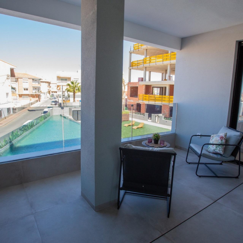 Tourist Licensed New Build Apartments Near the Beach in Lo Pagan San Pedro del Pinatar Modern Coastal Living with Strong Rental Potential This exclusive new development of 12 modern tourist licensed apartments is located in Lo Pagan, a popular coastal area of San Pedro del Pinatar, just 1 km from the beach. Positioned along the shores of the Mar Menor, this project offers a unique opportunity to enjoy the Mediterranean lifestyle while benefiting from excellent holiday rental potential in a highly demanded area. Lo Pagan is well known for its relaxed atmosphere, natural mud baths, promenade filled with restaurants and cafes, and easy access to both the Mar Menor and the Mediterranean Sea. It is an established destination for beach lovers, water sports enthusiasts and families looking for calm shallow waters and year round sunshine. Choice of 1 and 2 Bedroom Apartments The project offers apartments with either 1 bedroom and 1 bathroom or 2 bedrooms and 2 bathrooms, one of them en suite. Each property features a private terrace of approximately 9 m2 and a bright open plan layout where the fully furnished kitchen with appliances connects seamlessly to the living area. All apartments include a private storage room on the rooftop. Some units include a parking space and additional parking spaces are available as an option. High Quality Finishes and Modern Comfort These homes are delivered fully equipped with quality materials and finishes designed for comfort and durability: Fully installed ducted air conditioning Armored entrance door Electric shutters in living room and bedrooms Aerothermal system for hot water LED lighting Bathrooms with furniture, shower screens and electric towel rails Porcelain tiles from PORCELANOSA Fitted kitchens with modern appliances Rooftop Communal Areas with Pool, Gym and Solarium One of the highlights of this development is the rooftop communal area, easily accessible by lift. Residents and guests can enjoy a swimming pool, a fully equipped gym and a spacious solarium with artificial grass and sun loungers, all with open views of the surrounding coastal area. Excellent Location Close to Beaches, Marinas and Services The apartments are within walking distance to shops, restaurants and daily services, making them ideal for both personal use and holiday rentals. Distances to Key Points of Interest Lo Pagan Beach 1 km San Pedro Marina 1.5 km Dos Mares Shopping Center 2 km Lo Romero Golf 10 km Murcia International Airport 35 km Alicante Airport 80 km A Smart Investment by the Sea Whether you are looking for a holiday home, a rental investment or both, these tourist licensed apartments in Lo Pagan offer an unbeatable combination of location, quality and rental potential. Contact us today to receive more information or to arrange a viewing of these exceptional seaside apartments.