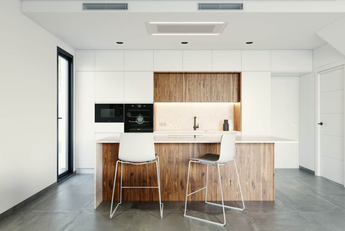 - Fully furnished kitchen with ultra-compact surface countertop (Silestone or similar), equipped with integrated fridge, induction hob on the island, ceiling-embedded extractor, elevated oven and microwave, and integrated dishwasher.