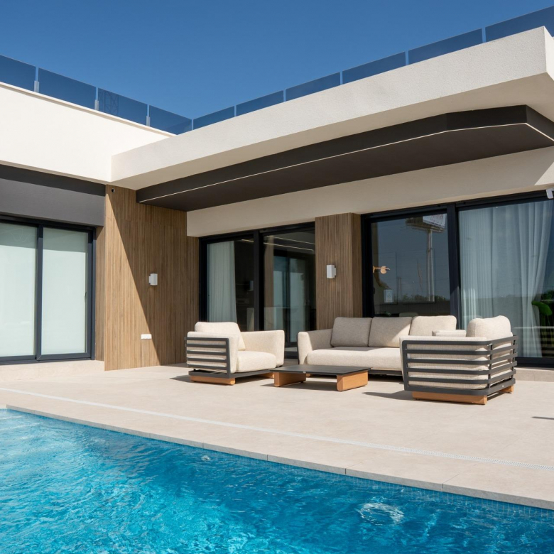 Newly built bungalows in San Miguel de Salinas with 2 communal swimming pools Mediterranean Lifestyle in a Natural Setting Discover this modern residential development of new-build bungalows in San Miguel de Salinas, a town in the south of the province of Alicante, in the Vega Baja del Segura region. This charming municipality combines proximity to the sea with the tranquillity of nature, making it an ideal place for both permanent residence and holidays. Housing Options for All Lifestyles The residential complex offers bungalow-style apartments with 2 or 3 bedrooms distributed in two options: Ground floor with private garden and storage room Upper floor with private solarium Each home has been designed with a modern and functional approach, providing comfort, natural light and outdoor spaces to enjoy the Mediterranean climate all year round. Communal Areas for Family Enjoyment This residential complex is completely enclosed and has excellent communal areas: 2 large communal swimming pools for adults and children Over 2,600 m² of landscaped green areas Children’s play area These facilities make the residential complex an ideal place for families, couples and retirees looking for quality of life in a safe and relaxed environment. Modern Qualities and Energy Efficiency The homes feature high-quality materials and meticulous finishes: Fully fitted kitchen Exterior carpentry with thermal break and double glazing Reinforced entrance door Bathroom furniture included Pre-installation of split air conditioning in living room and bedrooms Excellent Location Close to Golf, Beaches and Services San Miguel de Salinas is strategically located near tourist and natural areas: Golf courses such as Vistabella, Las Colinas and Campoamor less than 10 km away Orihuela Costa beaches 11 km away Torrevieja and La Mata lagoons just 8 km away La Zenia Boulevard shopping centre 9 km away Alicante-Elche Airport 58 km away (35 minutes by car) Murcia International Airport 63 km away (1 hour by car) Your new home on the Costa Blanca These properties represent an excellent opportunity for those seeking quality, comfort and location. Contact us now for more information or to schedule your visit and take the first step towards your life on the Costa Blanca.