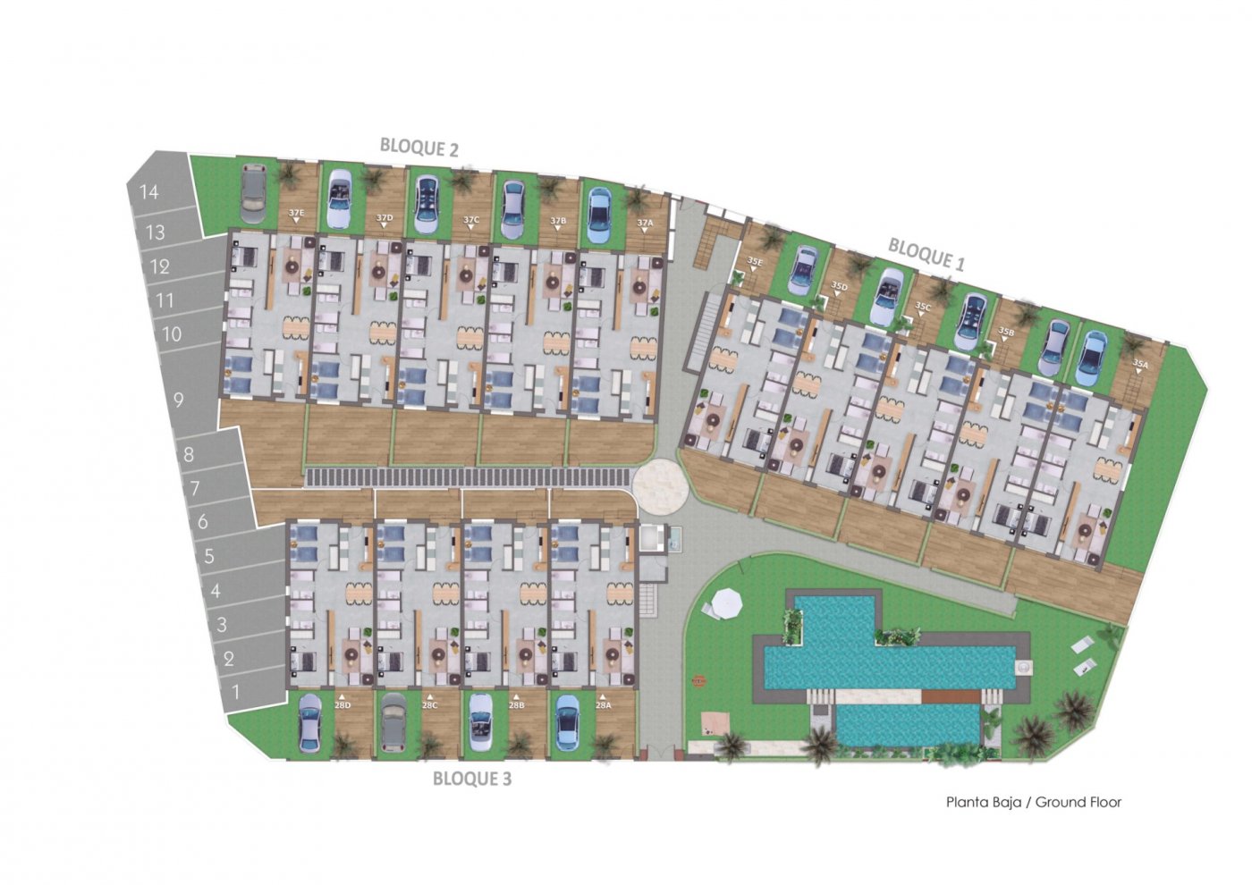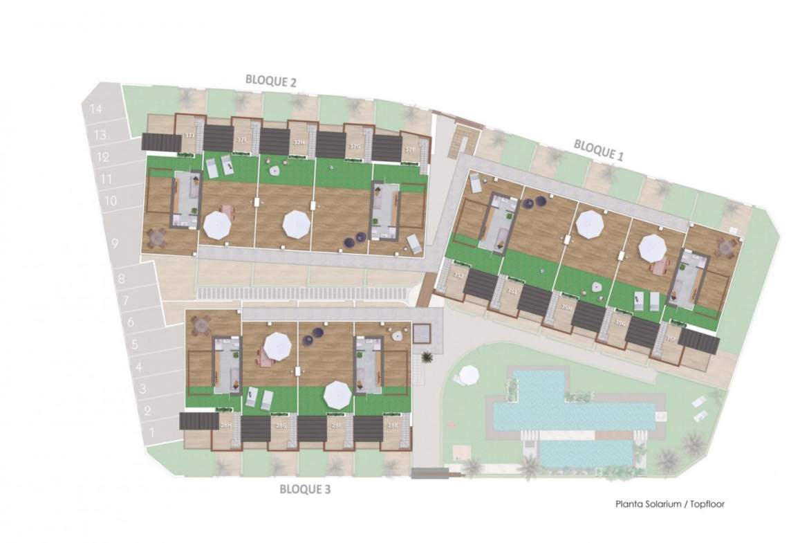NEW BUILD RESIDENTIAL OF BUNGALOW APARTMENTS IN PILAR DE LA HORADADA New Build Residential of 28 bungalows with 2 bedrooms, 2 bathrooms on the ground floor with private garden and 2 and 3 bedrooms and 2 and 3 bathrooms on the top floor with private solarium. Residential with communal swimming pool. Each property has parking space. A relaxing combination of natural materials and extensive decoration. With the practicality of having all the services, only 300 meters from the town centre of Pilar de la Horadada and less than 3 kilometres from the beach, in the heart of the Costa Blanca. Pilar de la Horadada is a typical Spanish village in the most southern part of the Costa Blanca. The large main street has supermarkets, lots of shops, restaurants and bars and some lovely squares. The beautiful beaches of Torre de la Horadada and Mil Palmeras with fine sand promenade is just 5 minutes away. The airports of Corvera (Murcia) and Alicante are respectively 40 and 55 minutes away.