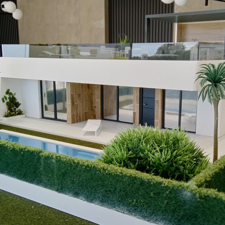 NEW BUILD VILLAS IN FINESTRAT New Build project of 10 modern design villas, in a natural setting with views of the sea and the mountains, near the Puig Campana golf course, and a short distance from the towns of Finestrat and Benidorm. The project will be divided into two construction phases, which in turn include two types of homes, with 1 or 2 floors, 3 double bedrooms, 2 or 3 complete bathrooms, living-dining room with integrated kitchen, laundry room, large terrace and garden, private pool, outdoor parking, 1 or 2 multipurpose basements and in some models closed underground garage. An options for a solarium at an extra cost. Villas built with the best qualities and latest advances in construction, among others: - Glass railings that do not break the continuity of the views. - First quality porcelain stoneware flooring. - Armoured entrance door. - Aluminium exterior carpentry with thermal bridge break and double insulating glass with low emissivity with air chamber and safety in areas at risk of breakage. - Smooth interior carpentry, made of white lacquered wood with stainless steel handles and fittings. - Fully equipped sliding wardrobes and dressing rooms. - Production of domestic hot water through a heat pump system with a 100L accumulator tank, with the support of solar panels on the roof. - High-grade electrical installation 9.2kw. - Installation of air conditioning through ducts with machines included. - Minimalist design kitchens, fully equipped with island, furniture and appliances included. - Private pool with lighting and beach area with pavement or artificial grass. - Fully customisable multipurpose basement, depending on the model with a garage area for a vehicle and pre-installation for an electric vehicle. Villas is located in a privileged environment on the Costa Blanca, in an elevated area at the foot of the mountains, surrounded by nature and other similar urbanisations, with excellent views of the sea and its surroundings. Very well connected by road with the nearby town of Finestrat, 10 minutes by car from shopping censers, the A7 motorway, the beaches and the nearby towns of Benidorm and Villajoyosa, and 30 minutes from the city of Alicante and its international airport.